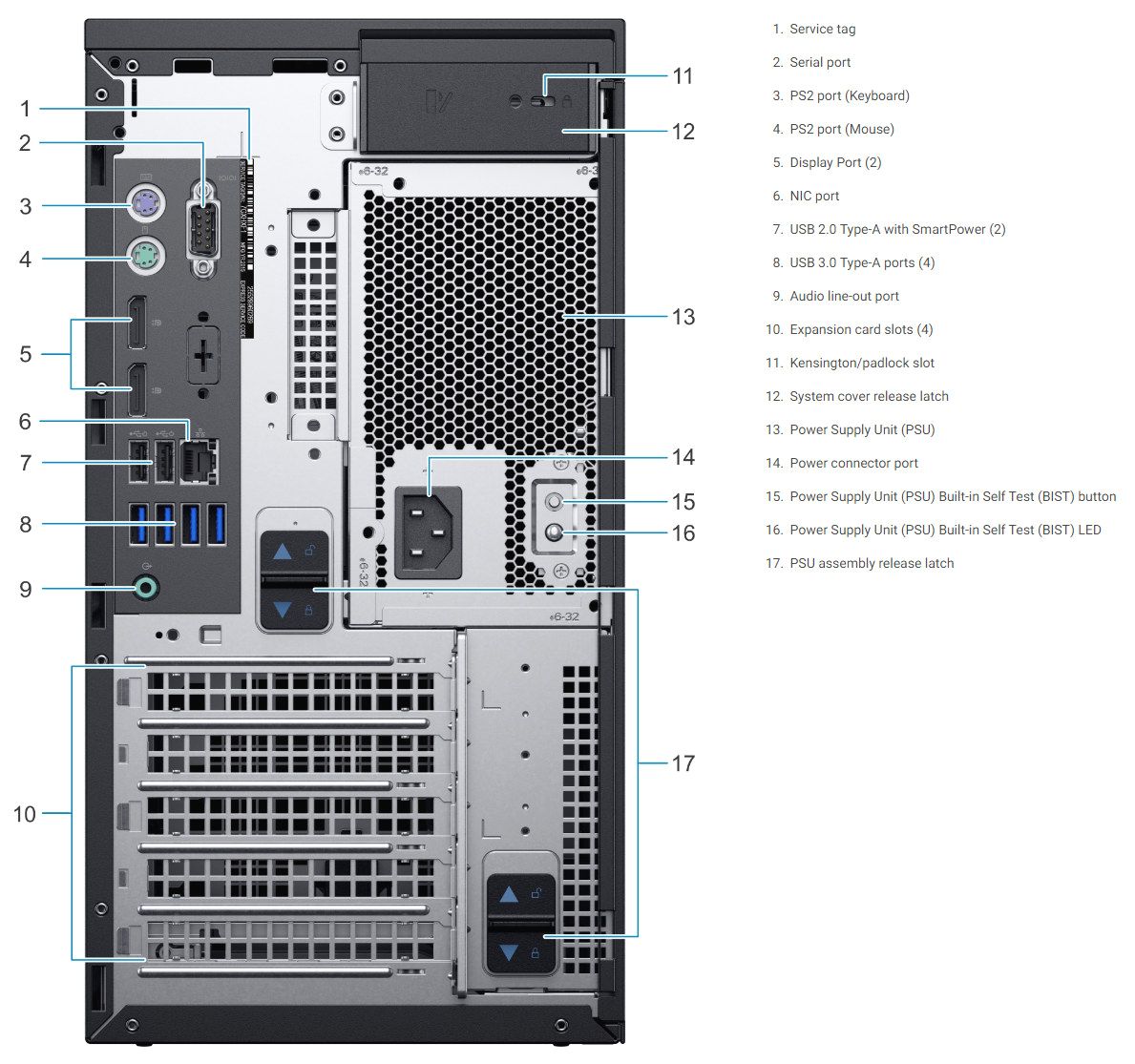 | Cổng kết nối | Front ports: 2 x USB 2.0, 1 x USB 3.0, 1 x USB 3.1 Rear ports: 2 x PS2, 2 x DisplayPorts, 1 x Serial, 1 x Audio, 2 x USB 2.0, 4 x USB 3.1 PCIe: 1 x Gen3 slot (x16) 2X Gen3 slot (x4) 1 X PCI |